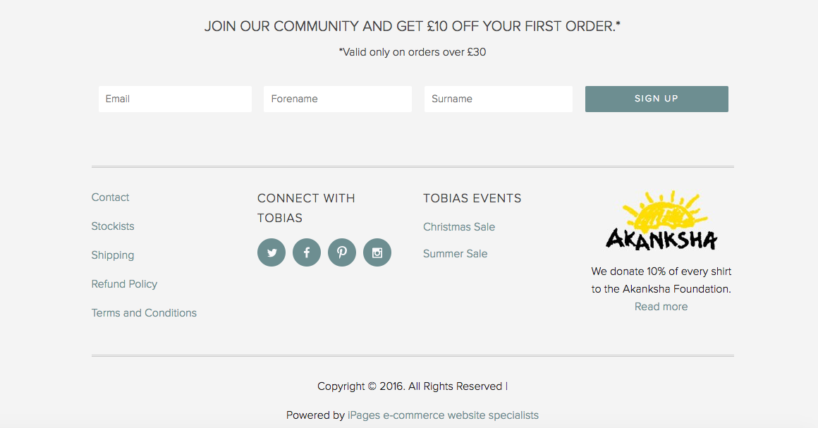 A good example of a business using this technique successfully is Tobias Clothing with their simple message 'Tobias Shirts support the Akanksha Foundation' Their message sticks and is clearly communicated throughout their eCommerce website with mentions in the header and footer across the whole website and even a page dedicated to their message.